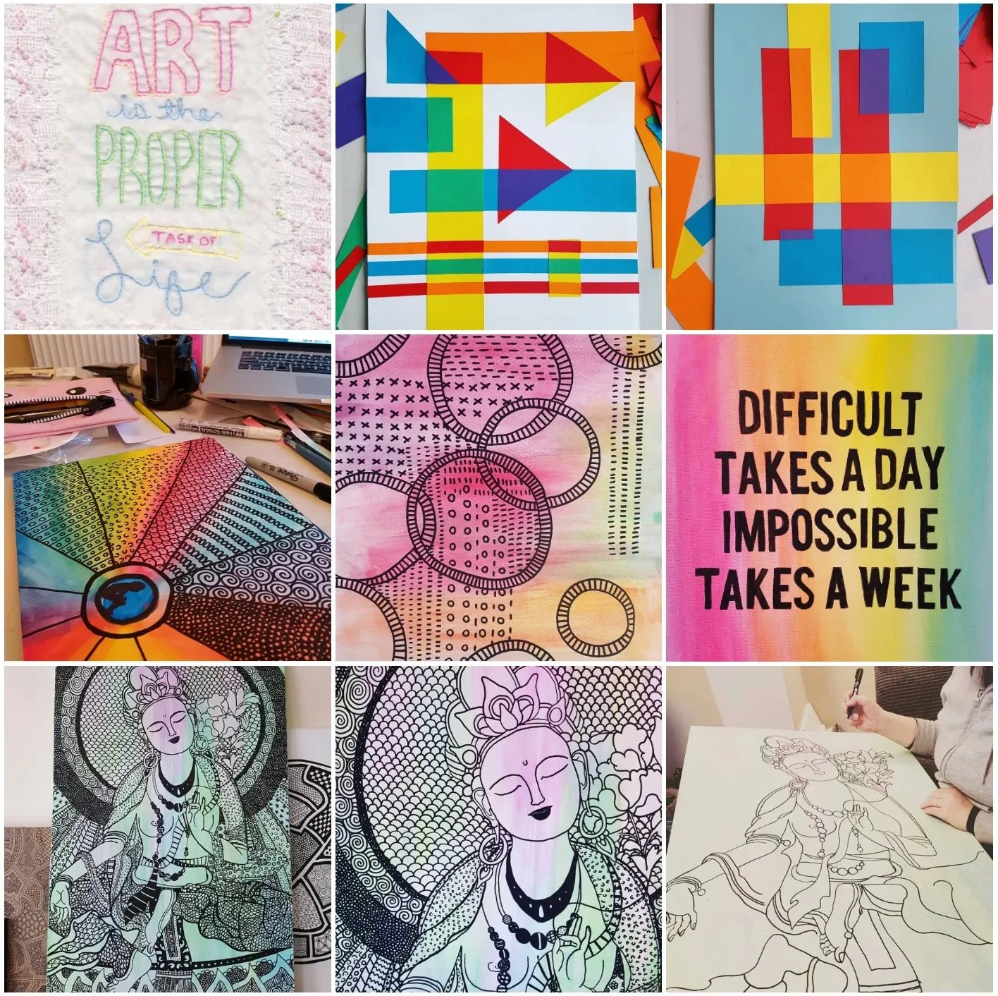 I began painting and drawing again, and more than that I began experimenting with different materials, methods and constraints. During one period, I gave myself a constraint that I could only create with scissors and glue — no mark making. At another time I decided to throw out all of my paint brushes and paint only with my hands or with found objects.