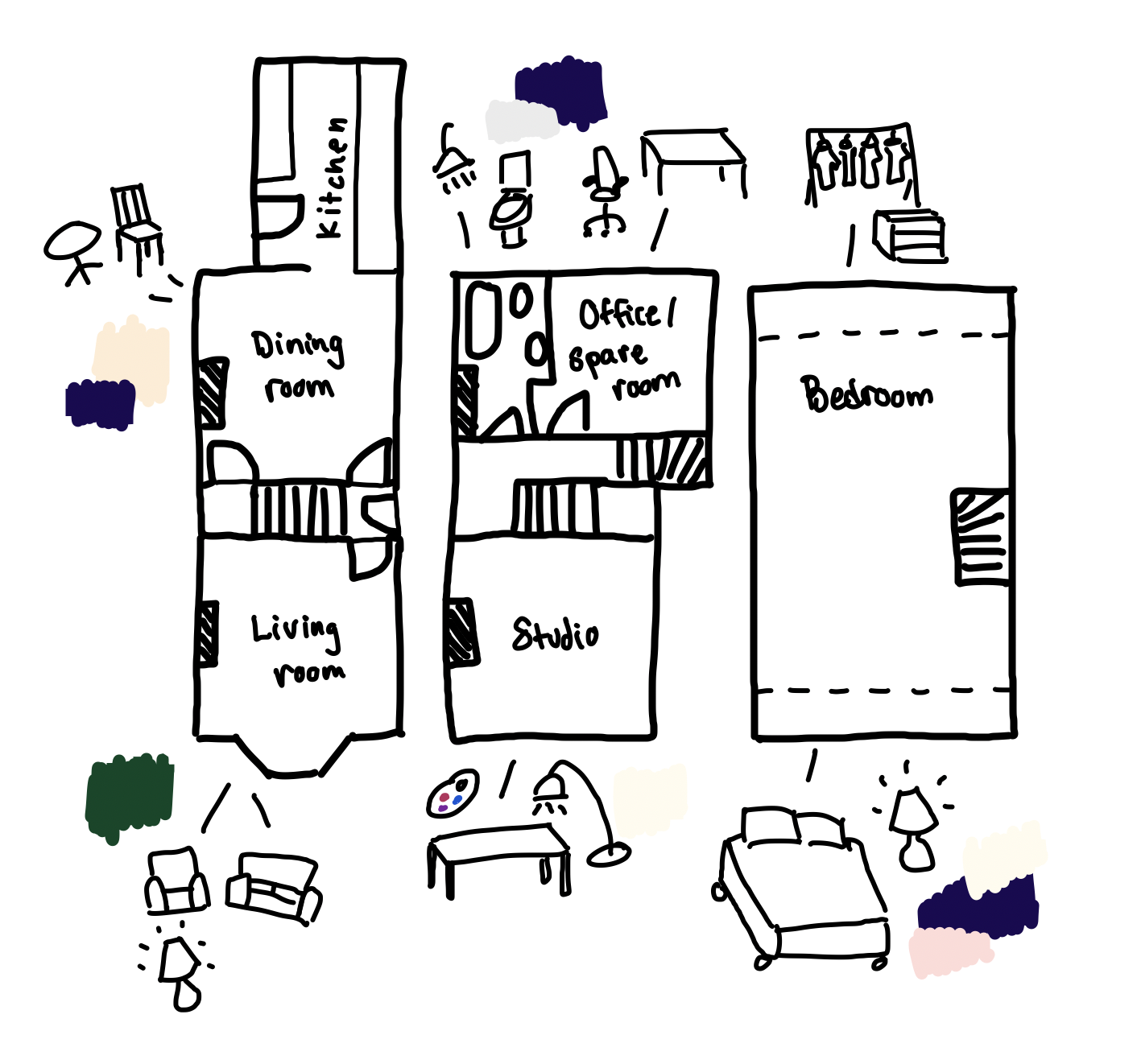 Intentions: The occupant works a full time job, but is engaged in creative and physical activities outside of work that need to be highly accessible, not stored or hidden away. The occupant sometimes works remote, but does not want her day-job to become a feature of her home—her day-job work-space needs to be minimal, her creative space, maximal.